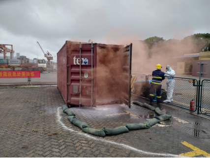 “报告中控室,8类危货堆场集装箱内有烟雾冒出,并散发腐蚀性气味,疑似集装箱内货物泄漏燃烧。”“收到!立即停止现场作业,所有人员和机械设备撤离,启动应急处置预案!”……
